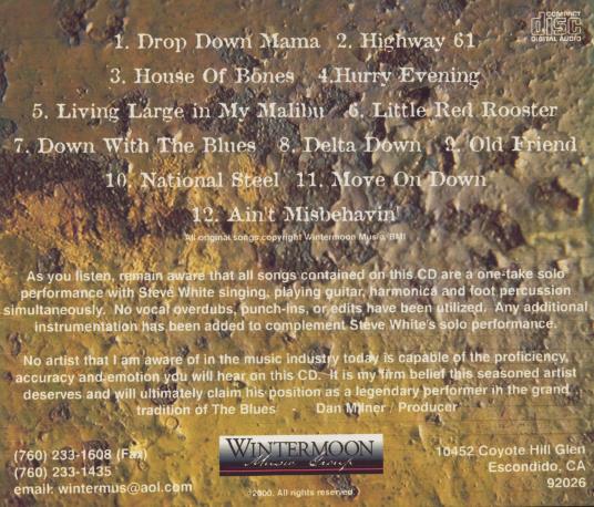Steve White is a talented artist known for his proficiency and emotion in solo performances of blues music. All songs on this CD are a one-take solo performance by Steve White, without any vocal overdubs. Additional instrumentation has been added to complement the solo performance.