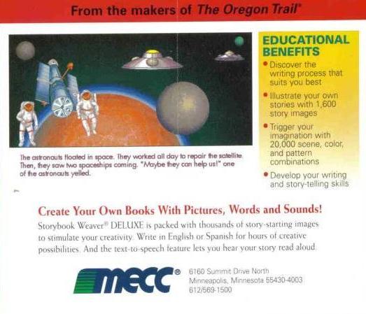 Storybook Weaver Deluxe allows kids to write and create their own storybooks complete with text, pictures and music. Kids can even record their storybook in words, either by using the voice software contained on the program disk or by reading their own story into the computer via microphone (not included). Storybooks contain a title page, where players can put the title of their story and their name. In addition, players can print out their story to make into a storybook they can show to their friends, parents, etc.