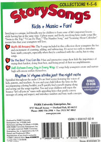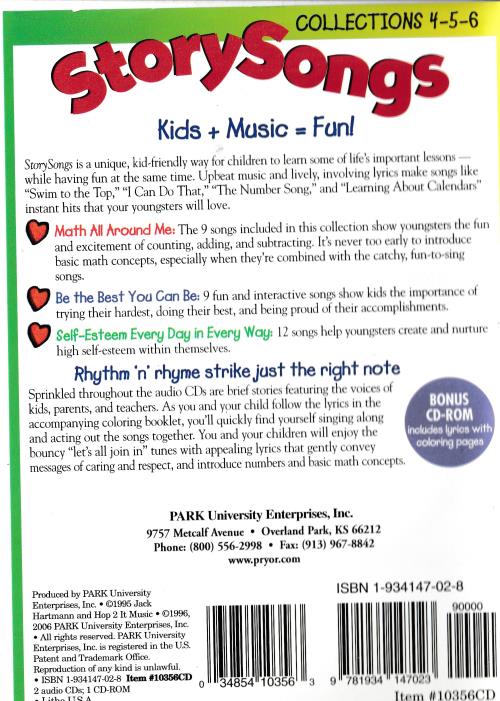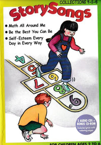 StorySongs is a unique, kid-friendly way for children to learn some of life's important lessons ... while having fun at the same time. Upbeat music and lively, involving lyrics make songs like "Walk Tall and Proud," "I've Got Positive Power," "The Calendar Song," and "Animal Fingers" instant hits that your youngsters will love. Collection 4-5-6 include... Math All Around Me: The 9 songs included in this collection show youngsters the fun and excitement of counting, adding, and subtracting. It's never too early to introduce basic math concepts, especially when they're combined with the catchy, fun-to-sing songs. Be the Best You Can Be: 9 fun and interactive songs show kids the importance of trying their hardest, doing their best, and being proud of their accomplishments. Self-Esteem Every Day in Every Way: 12 songs help youngsters create and nurture high self-esteem within themselves. BONUS CD-ROM: This Collection includes a bonus CD-ROM that includes lyrics with coloring pages. Rhythm 'n' rhyme strike just the right note ... Sprinkled throughout the audio CDs are brief stories featuring the voices of kids, parents, and teachers. As you and your child follow the lyrics in the accompanying coloring booklet, you'll quickly find yourself singing along and acting out the songs together. You and your children will enjoy the bouncy "let's all join in" tunes with appealing lyrics that gently convey messages of caring and respect, introduce counting, spelling, and possible solutions to common problems children face.
