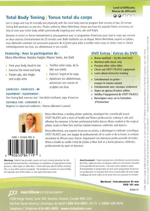 Total Body Toning I Tonus total du corps Get in shape and stay fit mentally and physically with this total body exercise program that consists of two 20-minute Toning Ball workouts on one disc. Pilates authority, Moira Merrithew, shows you how this popular fitness accessory can help to tone your entire body, while systematically targeting your arms, abs and thighs.