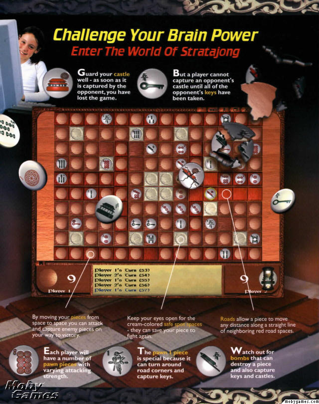Stratajong is an interesting board game that combines elements of Stratego and Chinese Chess. Each player controls a set of pieces consisting of Pawns (with a numerical strength from 1 to 9), Bombs, Keys and a Castle. The pieces are distributed randomly face down on a board. Each turn, a player may flip over a piece or move a friendly piece that is already face up. The goal is to find and capture all of an opponents keys and then their castle. As in Stratego, a higher number pawn captures a lower number pawn and bombs will blow up any other piece. Keys and castles may only be captured by number 1 pawns so protecting your weak pieces is crucial.