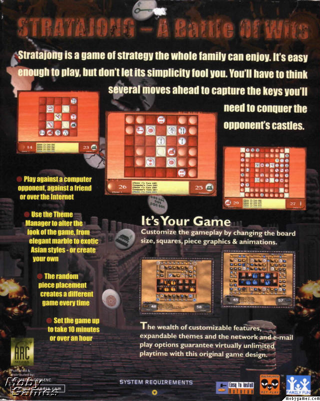 Almost every aspect of Stratajong is customizable from the board size to the distribution of pieces and the characters on the tiles. It can be played against the computer or over a network or the internet (in real time or by e-mail).
