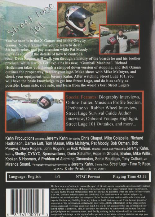 You've seen it in the X-Games and in the Gravity Games. Now, it's time for you to learn to do it! Sit back, relax pay attention while Pat Moody explains so' the details of how to control a walk you through a history of the boards he and his brother explains his new, "Gumball Machine". Richard ugh a stripped down version of stopping, and Bob Ozman road. Dave produce, while Darr Hodkinson takes yo outlines the proper way Meer your luge. Make shoes with Mike McIntyre, and check your equipment with Jeremy Kahn. After watching Street Luge 101, you will have the basic knowledge to get into Street Luge, and do it as safely as possible. Learn safe, ride safe, and learn from the world's best Street Lugers.