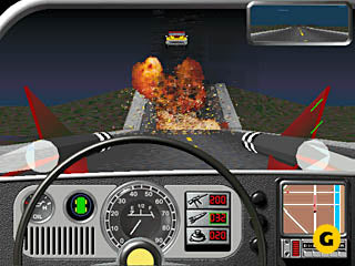 In the multiplayer version, you compete deathmatch style against other drivers. The view from your car can be changed from a behind the car view, to a cockpit view, to a cockpit view without a dashboard. Important information such as the status of your armor and weapons appear in the upper corners of the display. In addition, a radar like map shows the location of important objects (packages, other cars) in relation to you and the city map. Driving around your own created cities is easily accomplished and the difficulty settings allow many possible mission combinations.