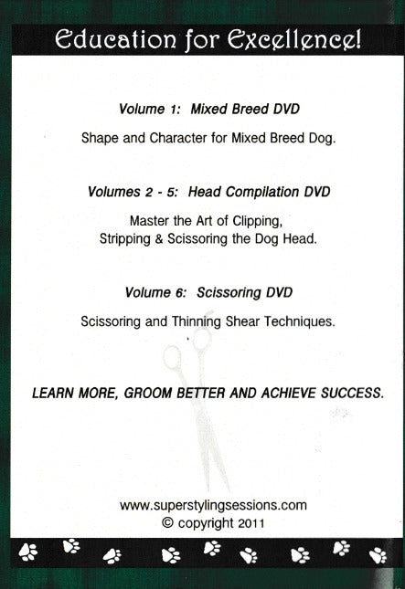 Volume 1: Mixed Breed DVD Shape and Character for Mixed Breed Dog. Volumes 2 - 5: Head Compilation DVD Master the Art of Clipping, Stripping & Scissoring the Dog Head. Volume 6: Scissoring DVD Scissoring and Thinning Shear Techniques. LEARN MORE, GROOM BETTER AND ACHIEVE SUCCESS.