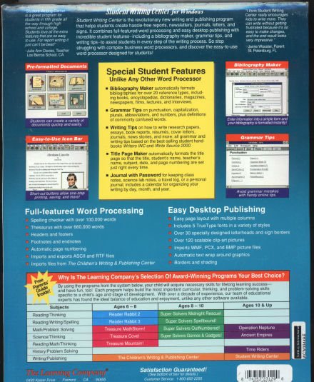 Student Writing Center combines word processing and easy desktop publishing with unique educational features to assist students in writing across the curriculum. Student Writing Center introduces students to important writing-related concepts such as how to plan, draft, or brainstorm ideas in preparation for writing.