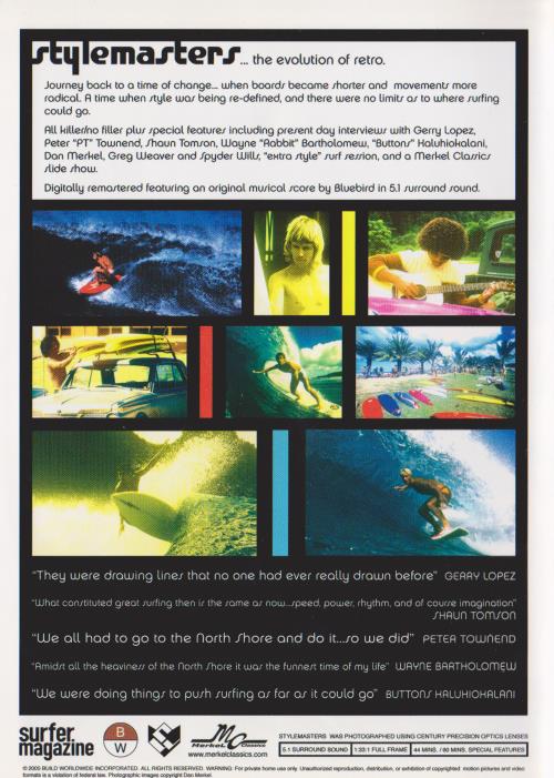 Journey bock to a time of change... when boards become shorter and movements more radical. Fl time when style was being re-defined, and there were no limits Of to where surfing could go. ll killer/no filler plus special features Including present day interviews with Gerry Lopez, Peter 'Pr Townend, fhoun Tomson, Wayne "Rabbit" Bartholomew, "Buttons" Haluhiokolani, Dan Merkel, Greg Weaver and fpyder WilL "eNtra style" surf session, and a Merkel Classics slide show. Digitally remartered featuring on original musical score by Bluebird in 5.1 surround sound. They were drawing lines that no one had ever really drown before