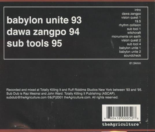 Recorded and mixed at Totally Killing It and Ruff Riddims Studios, New York between 1993 and 1995. Sub Dub consists of Raz Mesinai and John Ward. Published by Totally Killing It Publishing (ASCAP). © & P 2001 theAgriculture. All rights reserved. Total running time: 61:34 min.