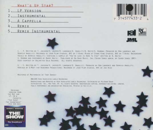Credits: Tracks 1-3 written by T. Jackson/K. Jasper/R. Lawrence/D. Angeliti/B. White/S. Hudman; produced by Ron Lawrence and Derrick Angeliti; recorded at Joon Plum Studios, NYC by T-Bird; mixed at Chung King Studios, NYC by T-Bird; background vocals by Derrick Angeliti. Contains a sample of "You're Love Is Here To Stay" written by B. White/S. Hudman and performed by Barry White. Tracks 4-5 remixed by D-Moet for Henchmen Productions; recorded at Joon Plum Studios, NYC by Joe Wize. Mastered at Masterdisk by Tony Dawsey. Original version from the Def Jam LP/CD/cassette "The Show: The Soundtrack" (314 529 021). (C) 1995 Rush Associated Labels Recordings. Manufactured and marketed by Rush Associated Labels Recordings. Distributed by PolyGram Group Distribution, Inc.