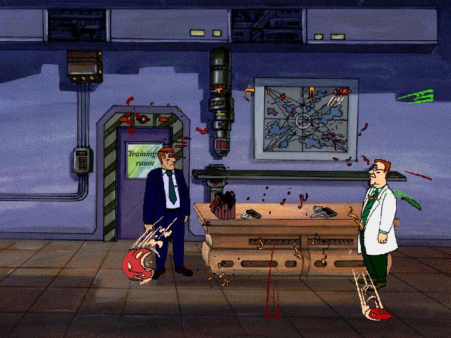 Superspy is an adventure game with classic Point & Click interface. Additionally it contains some simple arcade-like shooting sequences. These sequences are static screens in a 1st person view. You have to point on the enemies with the cross-hair cursor and click on them before they fall over. Sometimes reloading is necessary. At last there are time limited challenges like the disarming of a bomb. Since you have unlimited continues they shouldn't prove to be hard to master.