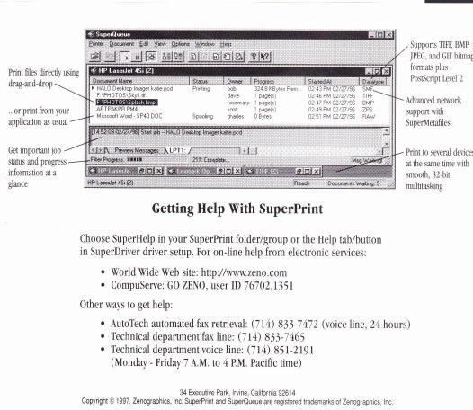 Faster printing — If you're printing documents with graphics or scanned images, you should see faster printing performance with SuperPrint. • Direct printing of data files — Printing bitmap or PostScript-language files has never been easier or faster. With SuperPrint, you can simply drag the file into the queue and it prints automatically — no other applications required!