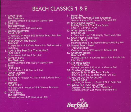 Beach Classics I & II is a two-part compilation assembled by Surfside Records featuring regional beach and soul bands. The set collects upbeat surf-influenced R&B, doo-wop and beach party tunes by artists such as General Johnson & The Chairmen, The Showmen, Band of Oz, Bobby Smith & The Poor Souls and Breeze Band. The recordings showcase tight vocal harmonies, driving rhythms and horn arrangements typical of southern beach music. Fans of vintage beach, surf and soul compilations will find this collection a vibrant snapshot of the era.