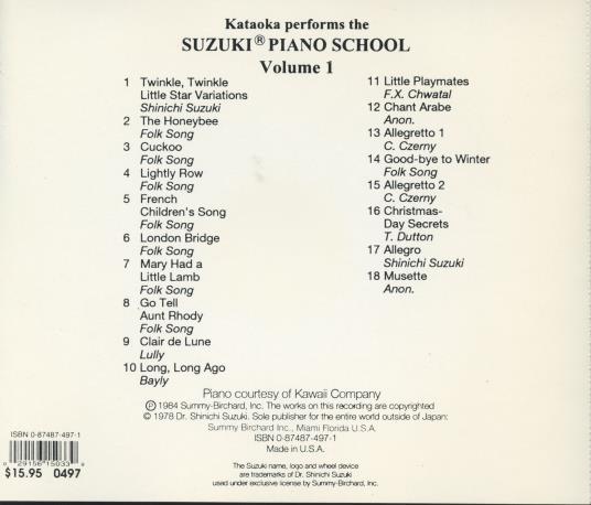 This companion CD to Suzuki Piano School Volume 1 was recorded by Haruko Kataoka, a co-founder--along with Dr. Suzuki and his sister-in-law, Shizuko Suzuki--of the Suzuki Piano Method. During her time as the accompanist for Dr. Suzuki's violin classes at the Talent Education Research Institute, she began to research piano pedagogy according to Dr. Suzuki's method of teaching the violin. From that time onward, she traveled extensively training teachers and teaching students. In addition to her training seminars in Matsumoto, Japan, she provided training at universities in North America, Europe and Australia.