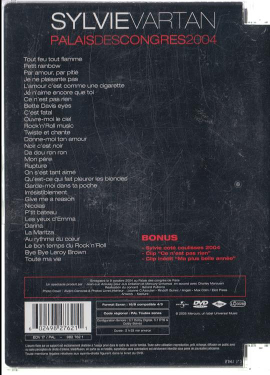 Live concert DVD recorded at the Palais des Congrès in 2004. This release captures Sylvie Vartan performing many of her classic hits in a full live show. Released by Mercury (Universal Music) in 2005.
