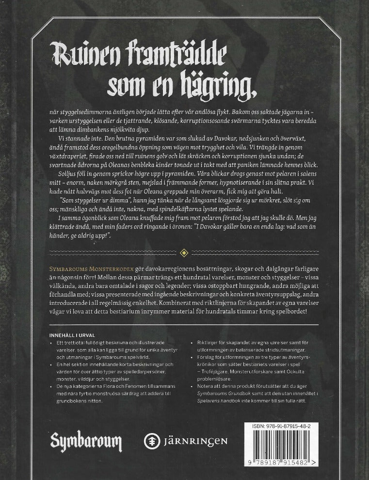 Symbaroums Monsterkodex gör davokarregionens bosättningar, skogar och dalgångar farligare och mer förunderliga än någonsin förr! Mellan dessa pärmar trängs ett hundratal varelser, monster och styggelser – vissa välkända, andra bara omtalade i sagor och legender; vissa ostoppbart hungrande, andra möjliga att förhandla med; vissa presenterade med ingående beskrivningar och konkreta äventyrsuppslag, andra introducerade i all regelmässig enkelhet. Kombinerat med reglerna och riktlinjerna för skapandet av egna monstruösa motståndare vågar vi lova att detta bestiarium inrymmer material för hundratals dramatiska, för att inte säga hårresande, timmar kring spelbordet.