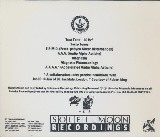 Manufactured and distributed by Soleilmoon Recordings. Anterior Research. Note: A collaboration under precise conditions with Isol B. Rubin of SE Institute, London. Courtesy of Robert King.