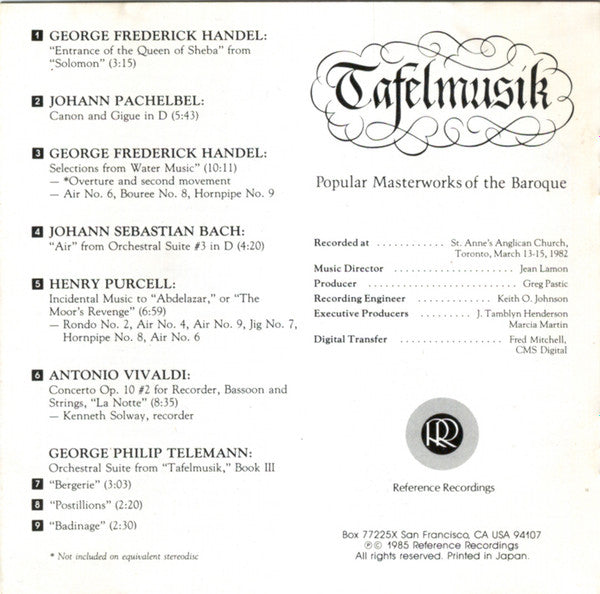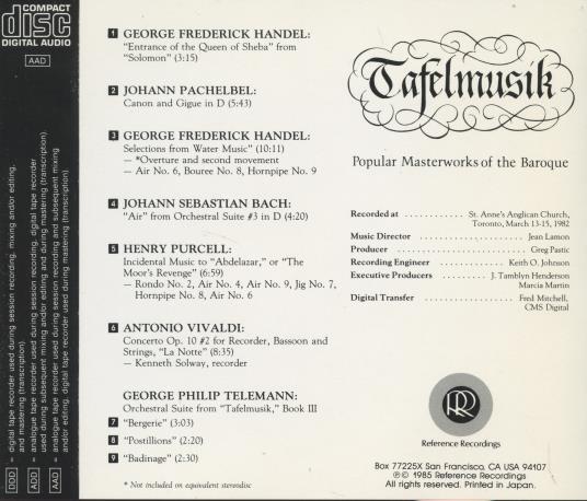 Tafelmusik: Popular Masterworks Of The Baroque MUSIC AUDIO CD 80s classical 1985