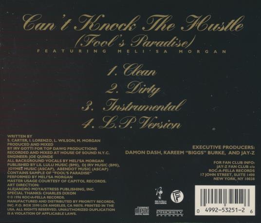 Tajz-Z is a hip hop artist associated with the Roc-A-Fella label. This release is a remix single of Can't Knock The Hustle (Fool's Paradise) featuring Meli'sa Morgan. The record blends rap verses with soulful R&B vocals and polished production typical of mid-1990s East Coast hip hop. The single reflects the era's remix culture and the collaborative approach of Roc-A-Fella releases.