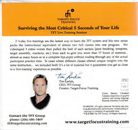 TARGET-FOCUS' TRAINING Surviving the Most Critical 5 Seconds of Your Life TFT Live Training Seminar 2 1/2-day live trainings are the fastest way to learn the TFT system and this new series packs the instructional equivalent of almost two full classes into one program. We videotaped 3 entire events then pulled the best of each section (joint breaking, weapons, target assembly, reactions, etc.) from each to give you more than 17 hours of material... almost as many hours as in a complete live event without wading through any of the actual participant practice time. In cases where different classes offered unique insights into the same instruction... we included both! It's a lot of material but it guarantees you get as close to a 'live training' experience as possible.