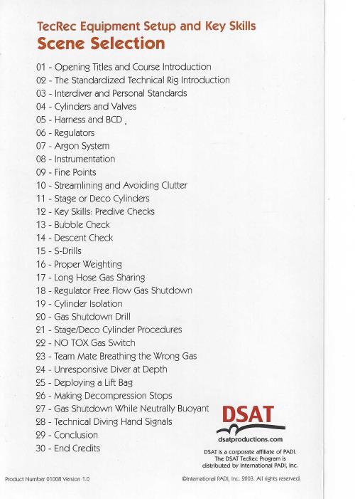 Skills Enhance your equipment and skill effectiveness with this ground breaking new DVD built on the tenets of the DSAT TecRec courses. For the experienced tec diver, those in the Tec Deep and Tec Trimix Diver courses, or anyone interested in state of the art tec diving, this DVD explains the specifics of standardized technical rig, key skills and the philosophies behind them. Watch and learn the skills necessary to become a competent technical diver.