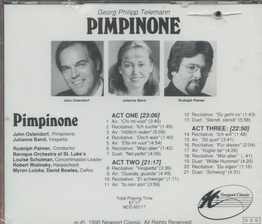 John Ostendorf, Julianne Baird, Baroque Orchestra Of St. Luke's, Rudolph Palmer - Georg Philipp Telemann: Pimpinone (Comic Opera In Three Acts)
