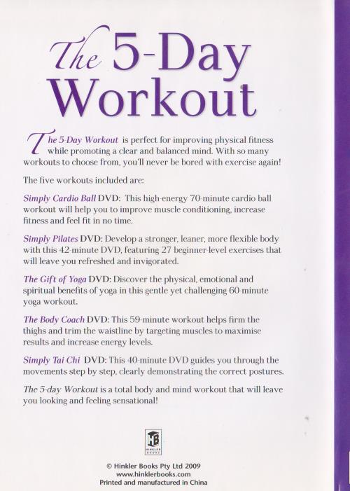 The five workouts included are: Simply Cardio Ball: 70 minute cardio ball workout Simply Pilates: 42 minute DVD featuring 27 beginner level exercises. The Gift of Yoga: Discover the physical, emotional and spiritual benefits of yoga in this gentleyet challenging 60 minute yoga workout. The Body Coach: 59-minute workout helps firm the thighs and trim the waistline. Simply Tai Chi: This 40 minute DVD guides you through the movements, step by step, demonstrating the correct postues.
