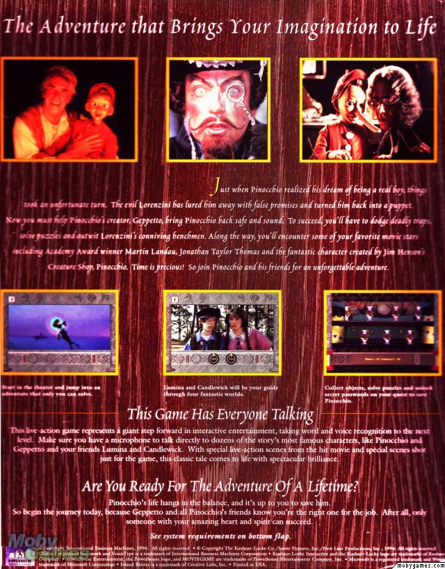 To succeed, you'll have to dodge deadly traps, solve puzzles and outwit Lorenzini's conniving henchmen. Sometimes, you'll have to turn yourself into a puppet, a fish, a bird or even a donkey to rescue Pinocchio. Along the way you must collect six passwords, each reflecting a lesson in morality that Pinocchio learns. You are aided by live-action guides Lumina and Candlewick who will offer different suggestions as to what to do but you must decide. There are plenty of wide-screen scenes from the movie and a ton of original footage.
