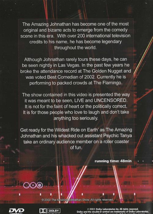 This video is the ultimate collector's item for the Amazing Johnathan's true fans. A 48 minute live performance of Johnathan taped at The Flamingo in Las Vegas. Be warned that it's not like what you are used to seeing on TV. It contains adult language and is not suitable for all audiences! See hilarious backstage scenes with Tanya, Johnathan's assistant and never before glimpses into the mind of The Amazing Johnathan. You will laugh until you are sore!