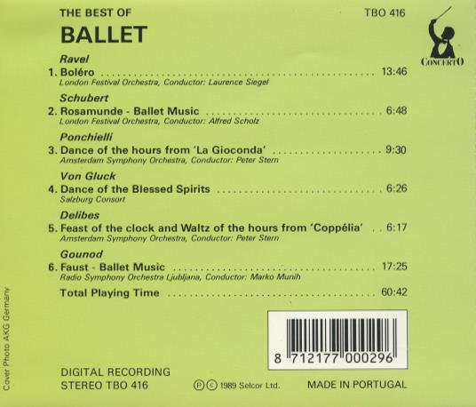 This compilation album features a selection of famous ballet compositions performed by various prestigious orchestras and conducted by renowned maestros. It showcases classical ballet music pieces by composers such as Ravel, Schubert, Ponchielli, Von Gluck, Delibes, and Gounod. Digital Recording Stereo TBO 416. Made in Portugal.