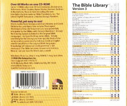 Welcome to The Bible Library, the top selling, award winning collection of Bibles and Reference Works available at an amazingly low price! This product is powerful, yet easy to use. The Bibles are linked to word studies, dictionaries and commentaries. Parallel verses are readily compared on one convenient screen. You can place your notes in the Bibles or References then quickly print or save to the handy notebook or to your own word processor.