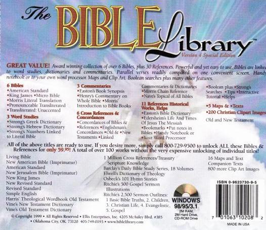 Welcome to The Bible Library, the top selling, award winning collection of Bibles and Reference Works available at an amazingly low price! This product is powerful, yet easy to use. The Bibles are linked to word studies, dictionaries and commentaries. Parallel verses are readily compared on one convenient screen. You can place your notes in the Bibles or References then quickly print or save to the handy notebook or to your own word processor.