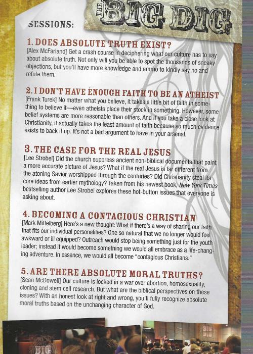 The Big Dig Apologetics Conference. This conference is part of the Focus on the Family ministry and featured 6 speakers discussing difficult questions such as the problem of evil, the historicity of Jesus, and how to choose a certain faith.