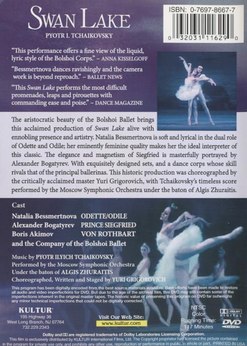 The aristocratic beauty of the Bolshoi Ballet brings this acclaimed production of Swan Lake alive with ennobling presence and artistry. Natalia Bessmertnova is soft and lyrical in the dual role of Odette and Odile; her eminently feminine quality makes her the ideal interpreter of this classic. The elegance and magnetism of Siegfried is masterfully portrayed by Alexander Bogatyrev. With exquisitely designed sets, and a dance corps whose skill rivals that of the principal ballerinas. This historic production was choreographed by the critically acclaimed master Yuri Grigorovich, with Tchaikovsky's timeless score performed by the Moscow Symphonic Orchestra under the baton of Algis Zhuraitis.