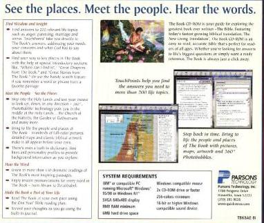 The Book CD-ROM brings the Bible to life with exciting interactive activities for the entire family using the QuickVerse engine, today's most advanced program for biblical exploration. Packed with photobubble tours of the Holy Land, a devotional tool, dramatic readings, and other applications, this product will provide hours of family fun and learning.
