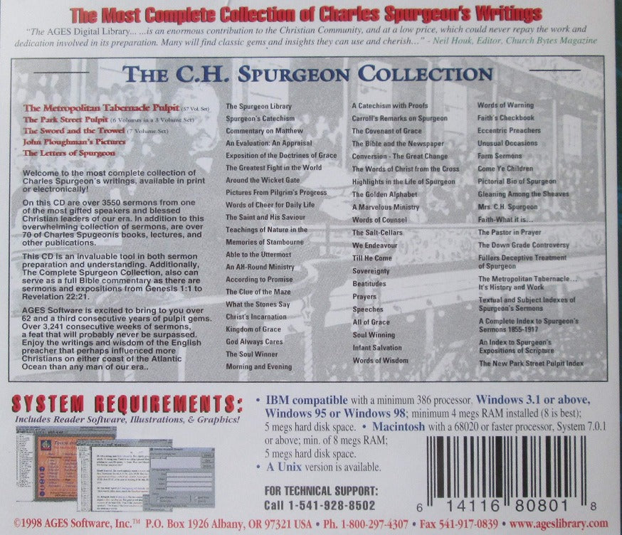Welcome to the most complete collection of Charles Spurgeon's writings, available in print or electronically! On this CD are over 3550 sermons from one of the most gifted speakers and blessed Christian leaders of our era. In addition to this overwhelming collection of sermons, are over 70 of Charles Spugeonis books, lectures, and other publications. This CD Is an invaluable tool in both sermon preparation and understanding. Additionally, The Complete Spurgeon Collection, also can serve as a full Bible commentary as there are sermons and expositions from Genesis 1:1 to Revelation 22:21. AGES Software is excited to bring to you over 62 and a third consecutive years of pulpit gems Over 3,241 consecutive weeks of sermons, a feat that will probably never be surpassed. Enjoy the writings and wisdom of the English preacher that perhaps influenced more Christians on either coast of the Atlantic Ocean than any man of our era.. The Spurgeon Library Spurgeon's Catechism Commentary on Matthew An Evaluation: An Appraisal Exposition of the Doctrines of Grace The Greatest Fight in the World Around the Wicket Gate Pictures From Pilgrim's Progress Words of Cheer for Daily Life The Saint and His Saviour Teachings of Nature in the Memories of Stambourne Able to the Uttermost An Ali-Round Ministry According to Promise The Clue of the Maze What the Stones Say Chi ist's Incarnation Kingdom of Grace God Always Cares The Soul Winner Morning and Evening
