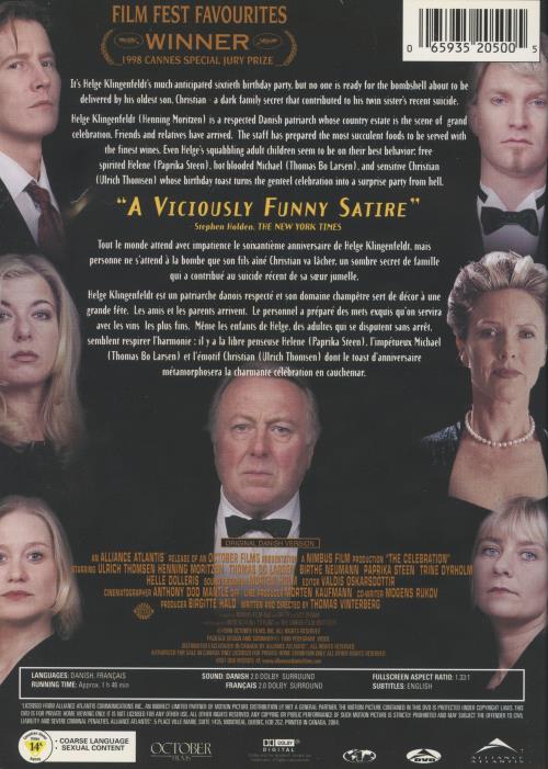 It's Helge Klingenfeldis much anticipated sixtieth birthday party. but no one is ready for the bombshell about to be delivered by his oldest son. Christian a dark family secret that contributed to his twin sister's recent suicide, Helge Klingenfeldi (Henning Montzen I is a respected Danish patriarch whose country estate is the scene of grand celebration. Friends and relatives have arrived. The staff has prepared the most succulent foods to be served with the finest wines. Even lielge's squabbling adult children seem to be on their best behavior: free spirited Helene (Paprika Steen). hot blooded Michael (Thomas Bo Larsen). and sensitive Christian (Ulrich Thomsen I whose birthday toast turns the genteel celebration into a surprise party from hell. "A VICIOUSLY FUNNY SATIRE" Stephen Holden. THE NEW YORK TIMES