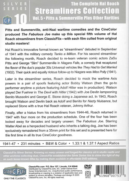 Pitts and Summerville, anti-Nazi wartime comedies and the CineColor produced The Fabulous Joe make up this special fifth volume of Hal Roach streamliners from ClassicFlix-with each film culled from original studio masters!Hal Roach's innovative format known as "streamliners" debuted in September of 1941 with the military comedy Tanks a Million. For his second streamliner the following month, Roach decided to re-team veteran comic actors ZaSu Pitts and George "Slim" Summerville in Niagara Falls, a comedy that recaptured the flavor of the duo's popular 30s Universal vehicles like They Had to Get Married (1932). Their quick and equally riotous follow-up to Niagara was Miss Polly (1941).Later in the streamliner series, Roach decided to mock the wartime Axis powers in a pair of spoofs featuring actor Bobby Watson (then the go-to performer anytime a picture featuring Adolf Hitler was in production). Watson played Der Fuehrer in The Devil with Hitler (1942) with Joe Devlin lampooning Benito Mussolini and George E. Stone doing a Japanese act. In 1943, Roach brought Watson and Devlin back as Adolf and Benito for Nazty Nuisance, but replaced Stone with a true Hal Roach veteran, Johnny Arthur.Finally, after a hiatus from his streamliners from 1944 - 46, Roach returned in 1947 with four more on the production schedule. One of the four has been locked away for decades and largely unseen: The Fabulous Joe. Starring Walter Abel as a henpecked husband who inherits a talking dog, Joe has been exclusively remastered from a 35mm print for this set and is presented here for the first time in all it's true CineColor goodness.