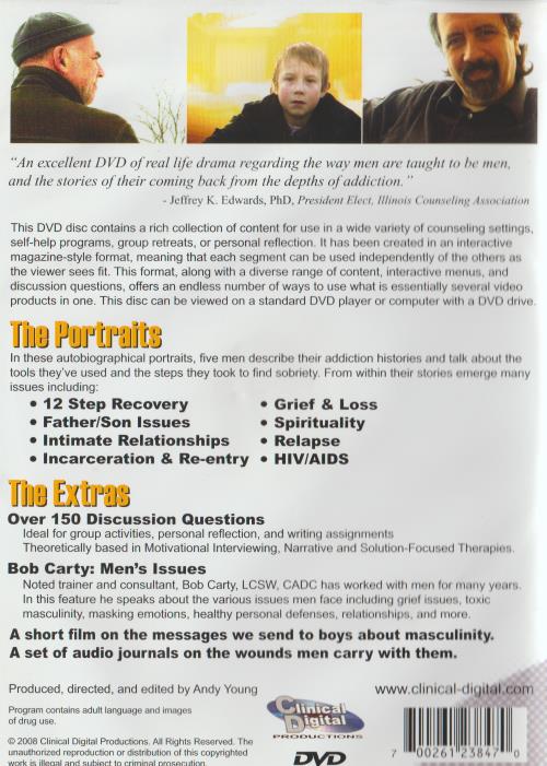 "An excellent DVD of real life drama regarding the way men are taught to be men, and the stories of their coming back from the depths of addiction." - Jeffrey K. Edwards, PhD, President El.,' This DVD disc contains a rich collection of content for use in a wide variety of counsolitH1 self-help programs, group retreats, or personal reflection. It has been created In an Interactive magazine-style format, meaning that each segment can be used independently of lie the viewer sees fit. This format, along with a diverse range of content, interactive Wrenn.„ i,1 discussion questions, offers an endless number of ways to use what is essentially several viduo products in one. This disc can be viewed on a standard DVD player or computer with a DVD drive. In these autobiographical portraits, five men describe their addiction histories and talk theta Ihi, tools they've used and the steps they took to find sobriety. From within their stories ()image nuury issues including: • 12 Step Recovery • Grief & Loss • Father/Son Issues • Spirituality • Intimate Relationships • Relapse • Incarceration & Re-entry • HIV/AIDS Over 150 Discussion Questions Ideal for group activities, personal reflection, and writing assignments Theoretically based in Motivational Interviewing, Narrative and Solution-Focused Therapies