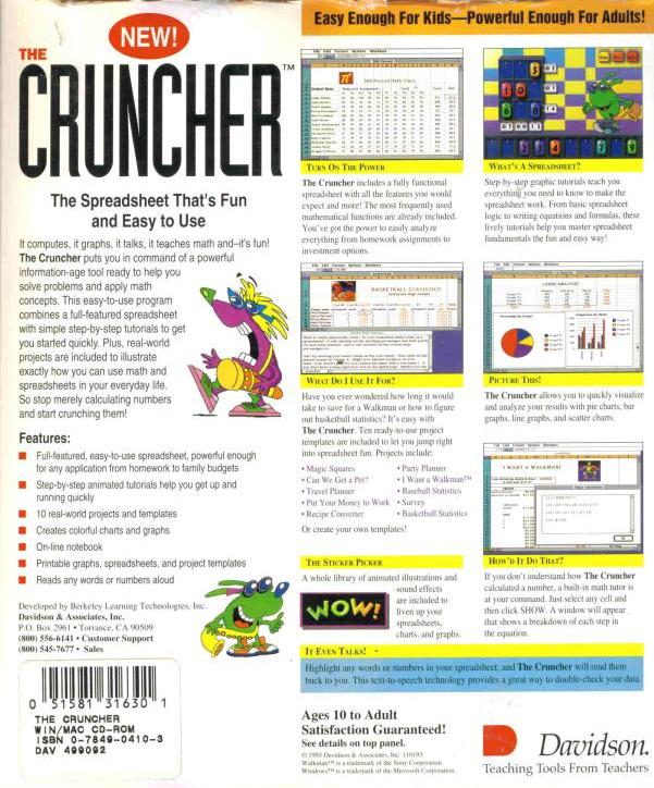 The Cruncher PC MAC CD kids learn about spreadsheets charts graphs numbers tool