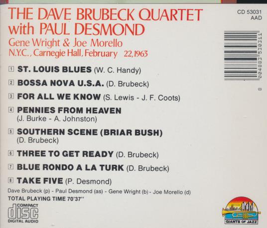 Dave Brubeck (p) - Paul Desmond (as) - Gene Wright (b) - Joe Morello (d)