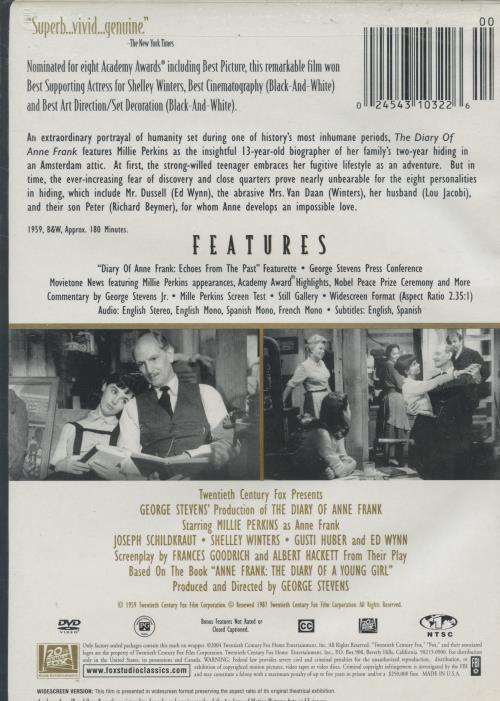 The Diary Of Anne Frank 1959 DVD VIDEO MOVIE Jewish girl war occupation Perkins