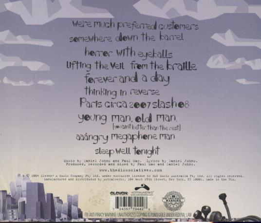 The Dissociatives are a collaborative project led by Daniel Johns and Paul Mac, combining alternative rock songwriting with electronic production and experimental pop textures. Their self-titled release blends melodic hooks with offbeat arrangements and layered synths, resulting in a sound that is both accessible and adventurous. The duo frequently mixes organic instruments and electronic processing to create unusual sonic landscapes. This album showcases their interest in songcraft tempered by studio experimentation.