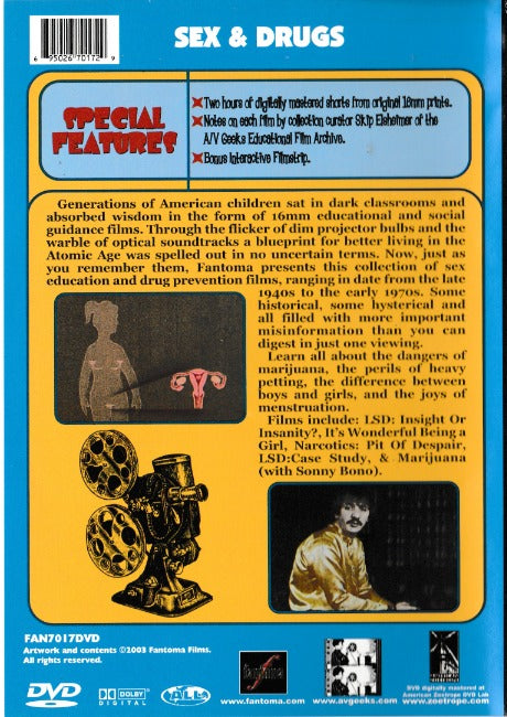 Generations of American children sat in dark classrooms and absorbed wisdom in the form of educational and social guidance films. Through the flicker of dim projector bulbs and the warble of optical soundtracks, a blueprint for better living in the Atomic Age was spelled out in no uncertain terms. Fantoma presents this collection of sex education and drug prevention films, ranging in date from the late 1940s to the early 1950s. Some historical, some hysterical, and all filled with more important misinformation than you can digest in just one viewing. Learn all about the dangers of marijuana, the perils of heavy petting, the difference between boys and girls, and the joys of menstruation. Films include: Insight Or Insanity?, It's Wonderful Being a Girl, Narcotics: Pit Of Despair, LSD:Case Study, & Ma Tijuana (with Sonny Bono).