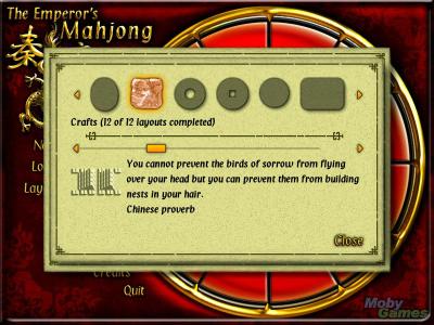 Traditional Mahjong takes a twist in this game. Although you can play the normal Shanghai style of mahjong where you match tiles in either single or 2-player mode, there is also an emperor's challenge. The emperor's challenge mode can only be won by completing all 72 layouts in the time limit. When you complete a layout in the emperor's challenge, you also gain chinese wisdom quotes.