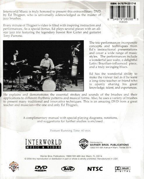 Interworld Music is truly honored to present this extraordinary DVD by Ed Thigpen, who is universally acknowledged as the master of jazz brushes. Every minute of Thigpen's video is filled with inspiring instruction and performances. As a special bonus, Ed plays several pieces with an all-star jazz trio featuring the legendary bassist Ron Carter and guitarist Tony Purrone. The trio performances incorporate concepts and techniques from Ed's instructional presentations and cover a wide range of music styles.
