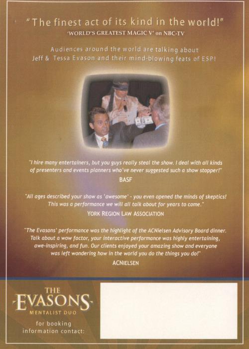 "The finest act of its kind in the world!" 'WORLD'S GREATEST MAGIC V' on NBC-TV Audiences around the world are talking about Jeff & Tessa Evason and their mind-blowing feats of ESP! "I hire many entertainers, but you guys really steal the show. I deal with all kinds of presenters and events planners who've never suggested such a show stopper!" BASF All ages described your show as 'awesome' - you even opened the minds of skeptics! This was a performance we will all talk about for years to come." YORK REGION LAW ASSOCIATION "The Evasons' performance was the highlight of the ACNielsen Advisory Board dinner. Talk about a wow factor, your interactive performance was highly entertaining, awe-inspiring, and fun. Our clients enjoyed your amazing show and everyone was left wondering how in the world you do the things you do!"