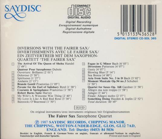 The Fairer Sax Saxophone Quartet are a British saxophone quartet specializing in arrangements and original works for saxophone ensemble. On Diversions they perform repertoire ranging from Baroque transcriptions to contemporary pieces and light classical arrangements. The ensemble emphasizes rich blend, clear articulation and expressive phrasing across a variety of textures. The programme showcases works by Handel, Bach, Schubert and modern composers arranged for saxophone quartet.