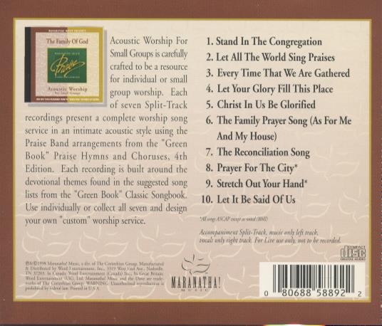 The Family Of God presents "Acoustic Worship For Small Groups," a collection of worship songs arranged acoustically for intimate, small group settings. It features split-track recordings designed to facilitate custom worship services based on the "Green Book" Praise Hymns and Choruses. New split track recordings from the "Green Book" Expanded 4th Edition. Each recording is built around devotional themes found in suggested song lists from the "Green Book" Classic Songbook. Use individually or collect all seven to design your own "custom" worship service.