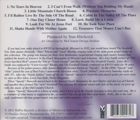 The Goodwill Trio are a traditional country gospel group with roots in the Ozark Mountains of Missouri and Arkansas. They were known for close harmonies, inspirational singing and country humor, and originally performed on KWTO radio in Springfield, Missouri in the 1930s. The group featured longtime performers who kept the old time gospel tradition alive and reflected the sound and style of the music grown up with in the region. This collection presents classic country gospel songs delivered in a warm, family style.