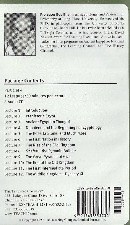 Package Contents Part 1 of 4 12 Lectures/30 minutes per lecture 6 Audio CDs Lecture 1: Introduction Lecture 2: Prehistoric Egypt Lecture 3: Ancient Egyptian Thought Lecture 4: Napoleon and the Beginnings of Egyptology Lecture 5: The Rosetta Stone, and Much More Lecture 6: The First Nation in History Lecture 7: The Rise of the Old Kingdom Lecture 8: Sneferu, the Pyramid Builder Lecture 9: The Great Pyramid of Giza Lecture 10: The End of the Old Kingdom Lecture 11: The First Intermediate Period Lecture 12: The Middle Kingdom—Dynasty XI